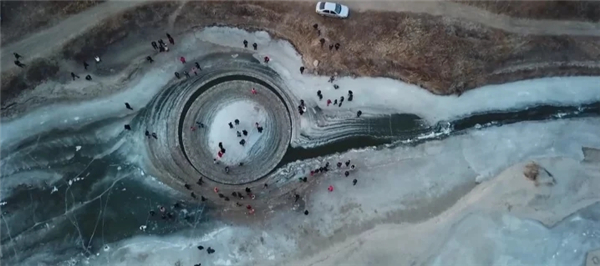沈阳市法库县境内辽河上,一个神秘的旋转冰盘引发围观。冰圈形状浑圆,在河中匀速自转。