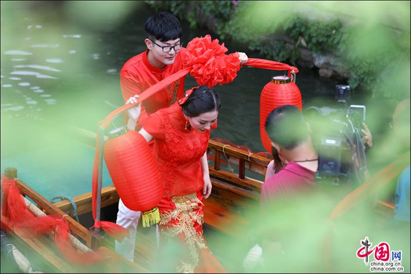 周庄的婚礼自古就是这样,当天必定摇快船,寓意着鱼水情深,夫妻此后互敬互爱、相守一生。船划动得越快代表小两口将来越勤快,日子越红火,也有快快得子的好兆头。接了新娘,花船还在水巷转上几圈,象征着比翼双飞。