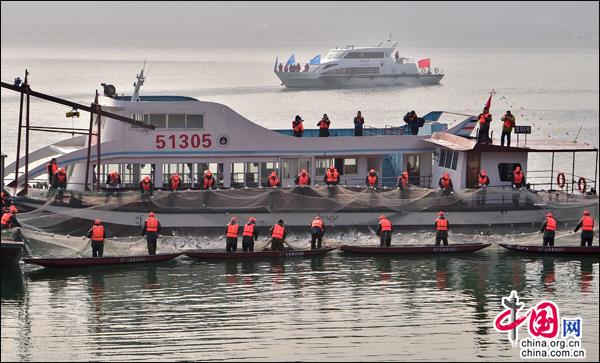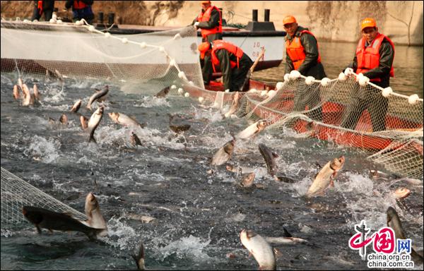 中国网1月13日讯“起鱼啰,哈哈……”1月12日,2018中国广元•白龙湖亭子湖生态有机鱼开捕仪式在位于昭化区虎跳镇的亭子湖畔举行。伴随着欢快而爽朗的笑声,10多名渔民一起用力收紧手中的网线,将今年的第一网鱼打捞上船,产量高达四万斤,之后将会迅速被发往成都、重庆等地……