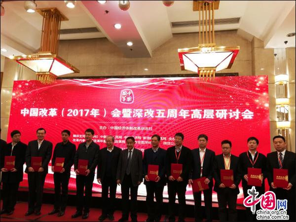 中国网1月15日讯 中国特色社会主义进入新时代,“惟改革者进,惟创新者强,惟改革创新者胜”这句治国理政名言无疑将更加大放异彩。日前,记者从北京举行的“中国改革(2017)年会暨深改五周年高层研讨会”上获悉,由国家发改委体改司安排部署,由中国改革网、中国经济体制改革研究会、中国经济体制改革杂志社具体承办,备受关注的“2017中国改革年度案例单位”征集评选活动圆满落下帷幕,“2017中国改革年度案例”单位名单正式对外揭晓。著名经济学家、原国家体改委副主任高尚全、全国人大常委、财经委副主任委员、中国经济体制改革研究会会长、国家发改委原副主任彭森向获奖单位颁发证书,对获奖单位给予充分肯定,对新时代全面深化改革取得胜利重要保障、重大意义作重要讲话,并勉励大家改革永远在路上,要解放思想,大胆探索。