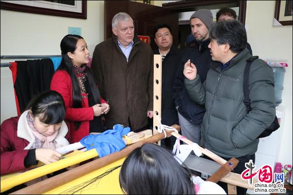 在城步苗绣研究所,考察组饶有兴致地参观了苗绣传承人伍前金的代表作——《城步苗族风俗图》。该图全长4.8米、宽1.2米,历时3年完成,被湘绣界誉为“苗族版的清明上河图”。考察组对该作品的高超技艺赞叹不已,并详细了解苗绣从业人数、员工收入及手工艺品的销售情况。