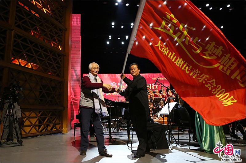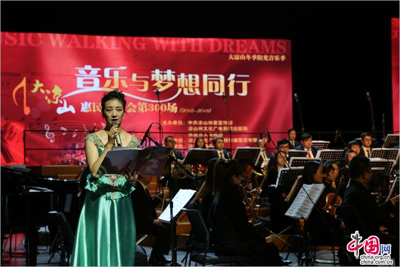 中国网2月1日讯 1月31日晚,《音乐与梦想同行》大凉山惠民音乐会第300场演出在四川凉山民族文化艺术中心金鹰大剧院上演,担任本场音乐会指挥的凉山交响乐团音乐总监唐青石带领演奏员们为现场观众奉献了一场精彩的音乐盛宴。据悉,大凉山惠民音乐会以满足群众不断增长的精神文化需求为目的,坚持定期举办,公益全免费、专业乐团演出,6年时间已举办300场,成为了一张有影响力有品牌的大凉山文化名片。
