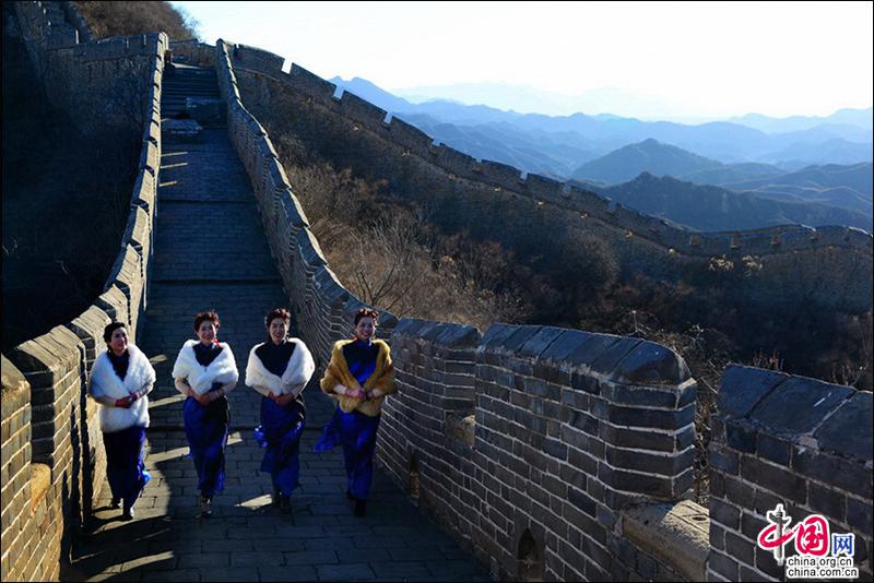 心田上幸福花开古长城,来自河北滦平文联的艺术家和滦平妇联、滦平旗袍会的佳丽们在古长城金山岭祈福迎春。