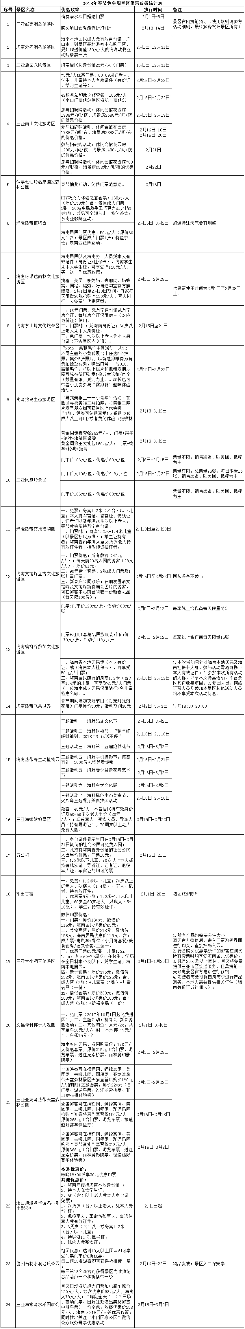 据悉,春节长假前后,三亚南山文化旅游区、海南槟榔谷黎苗文化旅游区、海南分界洲岛旅游区、陵水南湾猴岛生态旅游区、兴隆热带药用植物园等24家旅游景区将推出60余项优惠措施,放“价”迎客。