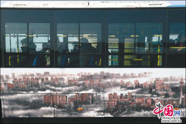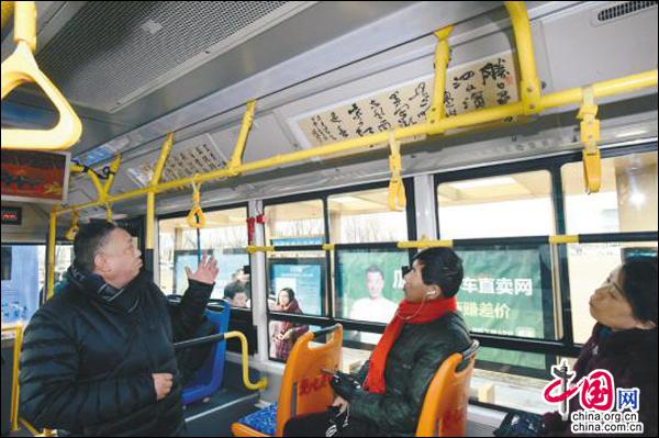 中国网2月11日讯 辽宁省沈阳市和平区文联与沈阳客运集团有限公司联合打造的国内首条艺术公交上线仪式9日在沈阳客运集团有限公司沈苏分公司130路全运五路始发站举行。首批四辆艺术公交车厢内部分别有行云流水、磅礴大气的书法和摄影作品,以及令人赏心悦目的美术和民间文艺作品,使公交车成为名副其实的流动艺术馆。