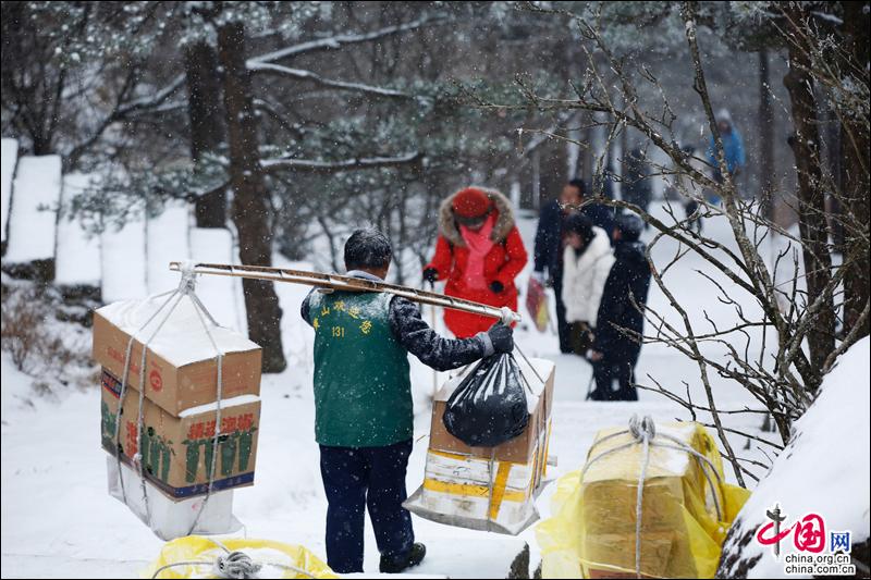 国家二级保护动物——黄山短尾猴在冰天雪地中觅食,看起来这个季节在生活不是那么容易,它们或在悬崖攀爬,或扮着鬼脸讨好游客,如给游客拜个早年。黄山挑山工,挑上近200斤的蔬菜、水果、水等山上酒店用品,雪天里汗水洒遍一个一个台阶。
