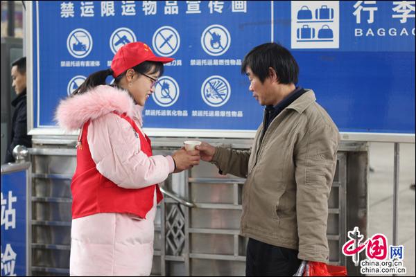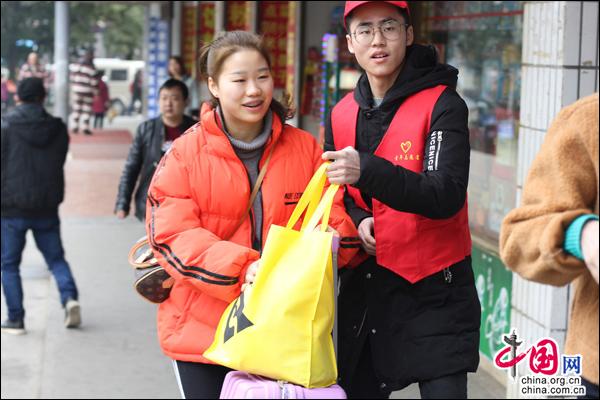中国网2月14日讯 “阿姨,我来帮您提行李吧。”“爷爷,来喝杯热茶吧。”2月13日,一群青年学生们穿着红马甲,不断穿梭在湖南邵阳火车南站,热情开展爱心服务。在志愿服务过程中,他们年轻的脸上始终洋溢着青春、暖心的笑容,让过往旅客如沫春风。