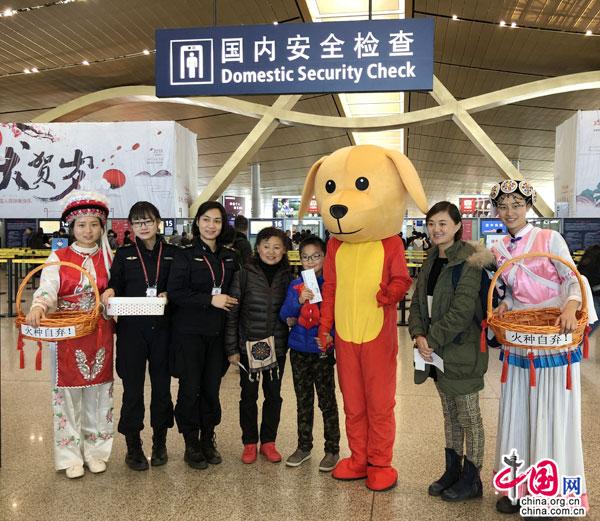 为烘托传统节日喜庆气氛,让出行旅客进出机场感受到浓浓的年味,志愿者们身着“小狗旺旺”及云南少数民族服装,走进旅客中宣称安全文明出行知识,并开展猜字谜等游戏,以轻松幽默的方式开展安全宣讲、提供问询服务,倡导安全、守法、文明出行。针对春运期间火种、烟花爆竹等违禁品增多等特点,志愿者们用送窗花、中国结等方式鼓励旅客主动妥善处置和自弃违禁品,让旅客在愉快的气氛中了解乘机规定和配合安全检查。在安检待检区营造快乐祥和、安全文明出行的喜庆氛围。