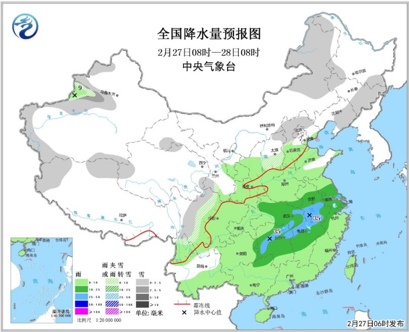 此外,根据气象台预测,2月27日08时至2月28日08时,新疆西部、内蒙古东部、东北地区西部和东南部、华北北部、川西高原等地有小到中雪或雨夹雪;江汉、黄淮南部、江淮、江南西部和北部等地有中雨,部分地区有大雨(25~35毫米)。内蒙古中东部有4~5级风。