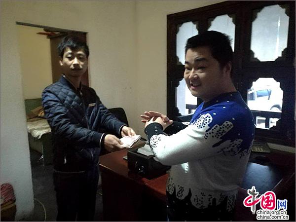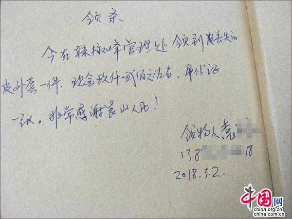 第二天一大早,袁先生一家走进辣椒峰景区找衣服。在景区门口的值班室,袁先生一眼就看见自己的衣服挂在房里的衣架上。接待袁先生的工作人员是复员军人王海强,今年元月份才到景区报到上班,工作服都还没有领到呢。王海强很热情,也很细致,他要求袁先生提供丢失的衣物和随身证卡信息,确认无误后,才从上锁的抽屉里拿出封存好的9200元现金,跟皮衣一起交还给袁先生。