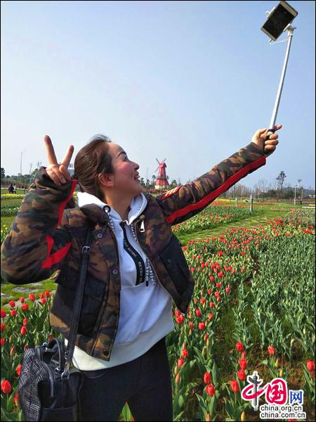 值得一提的是,当日恰逢三八国际妇女节,四面八方的妇女同胞携友带眷、成群结伴而来。整个七色花洲上,女神们都在与春天竞相媲美:郁金香花亭亭玉立,一片姹紫嫣红;而女神们则个个打扮得花枝招展,并纷纷拿出手机、相机等各种拍照工具,在郁金香花海中拍照、徜徉、休憩,享受春天迷人的气息……