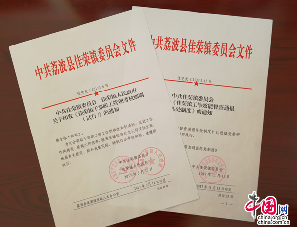 强化制度建设。制定完善《佳荣镇干部职工管理考核细则(试行)》《佳荣镇工作效能督查惩处制度》,定好标准、划好“红线”,把干部作风抓在日常、严在经常。同时,将干部日常工作情况与年终考核挂钩,促使自觉提高工作效率,助推各项工作有序推进。