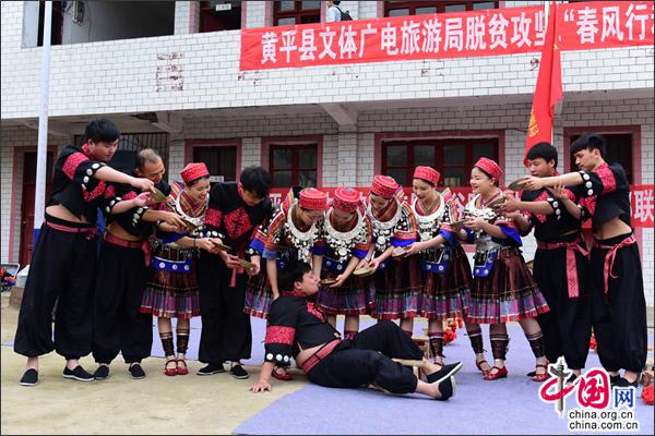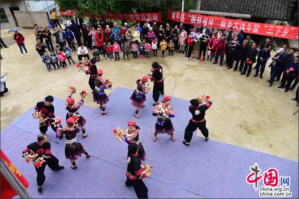 活动现场,该县民族艺术团结合党的十九大宣贯活动,带去了自行编排的锣鼓快板《党徽光耀新时代》,女声独唱《一带一路》,以及《苗族满月酒习俗》、《革家踩月》等氛围浓烈的民族代表性节目,精彩的节目演出赢得了现场村民群众的热烈掌声和阵阵喝彩。