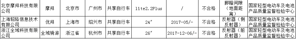 2017年共享自行车产品质量国家监督专项抽查不合格产品及其企业名单(来源:国家质检总局)