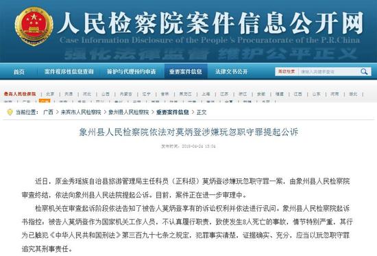 4月23日,金秀瑶族自治县旅游管理局原主任科员(正科级)莫炳登涉嫌玩忽职守罪一案,由象州县人民检察院审查终结,依法向象州县人民法院提起公诉。目前,案件正在进一步审理中。