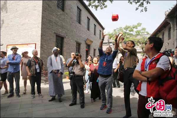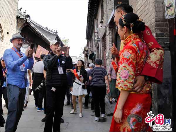 一栋栋古朴的建筑,丰富多彩的传统技艺,让参观嘉宾应接不暇,参观团一行先后参观了周村历史文化展馆、中华名小吃周村烧饼制作、琉璃制作工艺等国家级非物质遗产和腰鼓表演、抛绣球、鸣锣开市、戏曲表演等别具地域特色的民俗展演,充满东方情调的人文环境和表演项目,令参观团成员兴趣盎然。当品尝到美味可口的烧饼时,他们纷纷伸出大拇指赞不绝口,体验抛绣球表演时,外国友人也饶有兴致地穿上状元服当一回“新郎”。参观团实地感受到了周村作为丝绸之路发源地之一的独特魅力和“厚道、诚信、开放、包容”的鲁商精神以及自然淳朴的人文情怀。