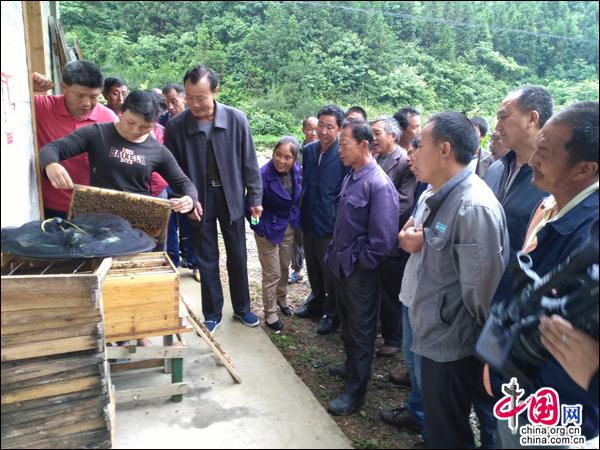 中国网6月5日讯 “今年雨水多,要预防蜜蜂囊状幼虫病。山区早晚温差大,应注意蜂群保温,晴天翻晒箱内保温物,以增加蜂群温度……”日前,湖南省洞口县古楼乡相山村开展脱贫攻坚政策服务主题日活动,驻村帮扶工作队邀请该村中蜂养殖合作社负责人肖尊龙就当前的蜂群管理授课。随后,工作队又将课堂搬到该村贫困户胡华平的家中,在蜂箱边现场教学,给准备通过养蜂脱贫的群众吃了一颗定心丸。