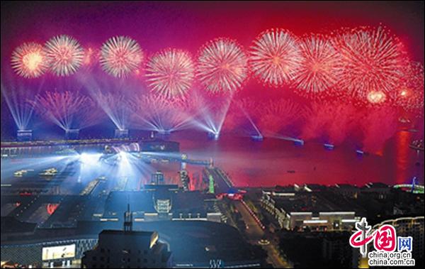中国网6月10日讯 海风温润,啤酒飘香,花团锦簇。9日晚,备受期待的上合青岛峰会灯光焰火艺术表演《有朋自远方来》在青岛奥帆中心隆重上演,来自江西省李渡烟花集团的三万余枚烟花点燃了青岛的上空,演绎了绝美的海上烟花秀,又一次刷爆了朋友圈。
