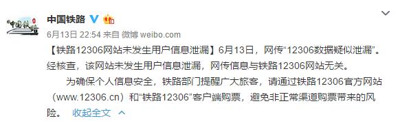 中国网6月14日讯 中国铁路总公司官方微博发布一则消息:6月13日,网传“12306数据疑似泄漏”。经核查,该网站未发生用户信息泄漏,网传信息与铁路12306网站无关。