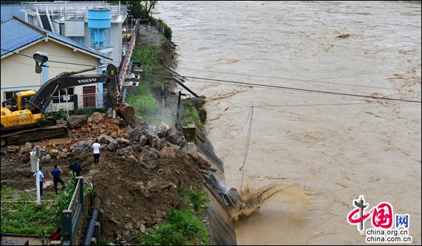 11日下午,朝天城区嘉陵江河堤因为洪水强烈冲刷,出现垮塌。朝天区住建局党员突击队迅速组织出动250余台次大型运输车辆,运送土石方1万余方对河堤进行保护性回填,以减弱洪水对垮塌河堤边缘的冲刷,及时有效遏制了险情。该局负责人介绍,目前,该局5个应急小分队全城24小时巡查,以便及时应对突然出现的险情。