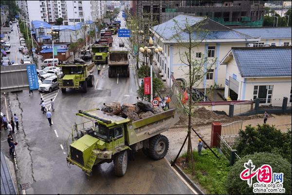 区交通运输局19支工程队抢通公路36条;朝天镇党员干部连夜奋战10多个小时,组织100多户商户安全转移;海事、公安、消防等部门于洪流中拦截、击沉油罐9个,固定漂浮罐车3辆;各地群众积极展开自救……