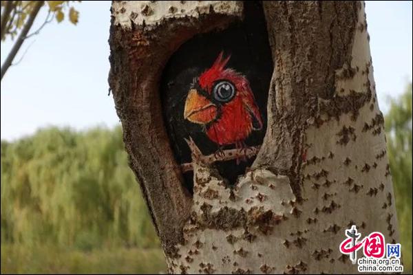 来到凤凰公园,你会在公园里的树上发现调皮可爱的小精灵,它们或隐藏在树洞里偷偷地监督你是否在晨练时偷懒,或爬在树干上向过往的行人卖萌撒娇,但它们不是真的小动物,它们是只是绘在树洞上的树洞画。