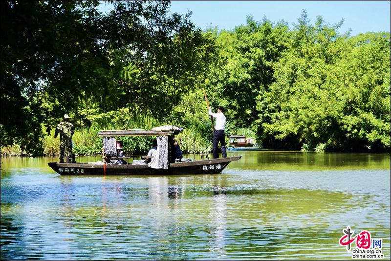 “这里是杭州的肺”,船工朱虹一边摇橹一边以一口好听的余杭普通话不急不慢的说道,“我们现在在‘肺的中央’,这里的负氧离子含量最高,洪园是西溪湿地的第三期工程,自2008年开园以来,这里的鸟类从80多种到现在的160多种”,“水域面积扩大,空气越来越好,水质也越来越好”。朱虹,是湿地地道的原住民,以前捕鱼为生,现是洪园的船工,他一脸自豪的说“我们可以进来(从事这个工作)也是择优录取的呢”,在谈到薪资,他笑着说“旺季的时候一整天都在摇橹”。朱虹的工资是每月两千多块加提成,每出一次船提成为十块钱,他所服务的是渔夫之旅项目,也是洪园非常有特色的体验项目之一。