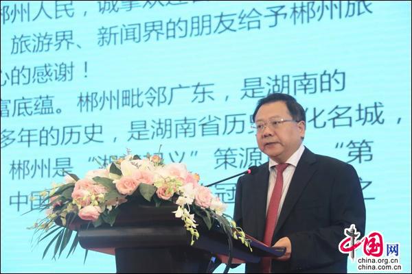 湖南省政协副主席、郴州市委书记、市人大常委会主任易鹏飞在致辞中指出,郴州文旅资源极其丰富、极为独特、极富底蕴。郴州毗邻广东,是湖南的“南大门”。“郴”字独属郴州,已有2200多年的历史,是湖南省历史文化名城,天下第十八福地,古村古镇古建筑遍及全市。郴州是“湘南起义”策源地、“第一军规”颁布地、“半条被子”故事发生地、中国女排成就“五连冠”的腾飞之地,红色旅游资源有30余处。郴州是生态之城,森林覆盖率近70%,被评为全国绿化模范城市、国家园林城市、国家森林城市、全国50大氧吧城市、国家卫生城市。郴州有中国有色金属之乡、中国银都、中国观赏石之城•矿物晶体之都的美誉,已成功举办四届的中国(湖南)矿物宝石博览会成为旅游新热点。厚重的历史、别样的文化、“五彩缤纷,五色辉映”的旅游资源汇集于此,让郴州成为名副其实的中国优秀旅游城市、国家休闲城市和中国最具幸福感城市之一。