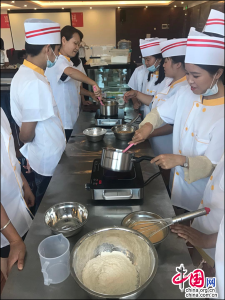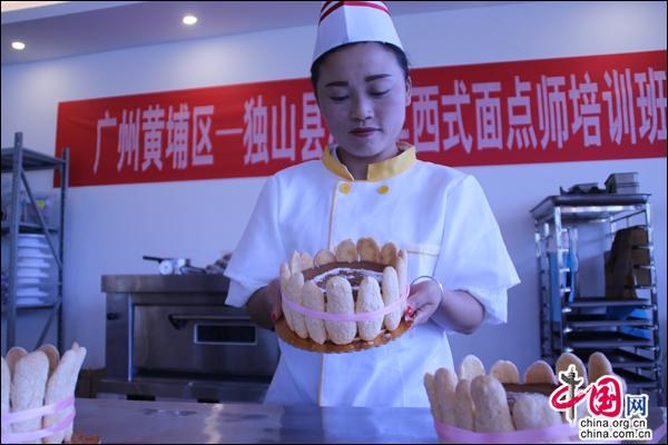 在贵州省独山县经济开发区创客大厦,笔者见到了一场生动活泼的技能培训。来自贵州大学学术交流中心的孙磊老师,正在为“广州黄埔区——独山县2018年西式面点师培训班”的学员们授课。学员们一边在操作台上认真制做各种面点,一边悉心听取孙磊老师的点评和指导。孙磊老师介绍说,这些学员来自独山县内各镇区,其中还有部分是建档立卡贫困户。