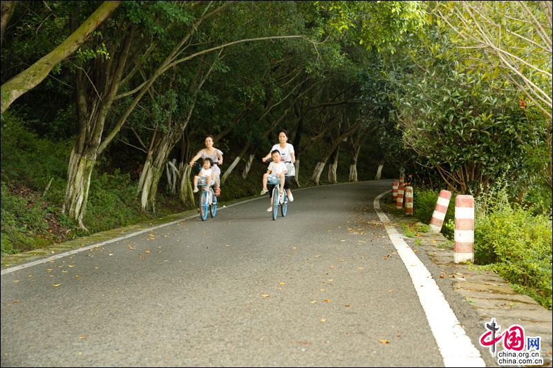 乘上电瓶车沿着环湖公路转下来,阵阵凉风吹来,一扫一路奔波的疲倦和闷热,满眼绿意伴着林间鸟鸣,令人心旷神怡。