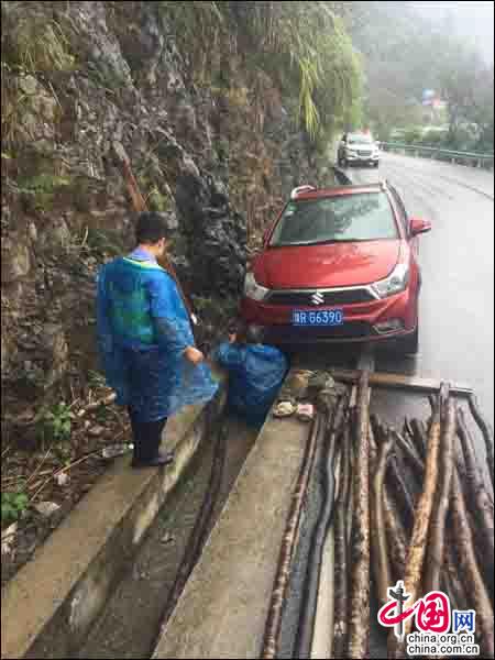 中国网9月4日讯 突如其来的降雨,给前来荔波旅游的游客带来不便,关键时刻,总有这样一些人为遮风挡雨保护人民群众的安全。9月3日,荔波县公安交警大队茂兰中队执勤民警在雨中帮助一辆不慎溜进沟渠的小轿车解困的事情,得到旅游游客极大认可。