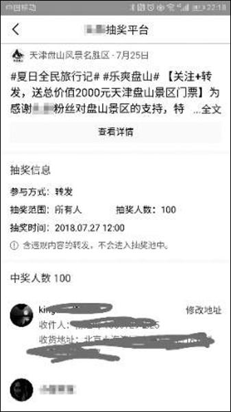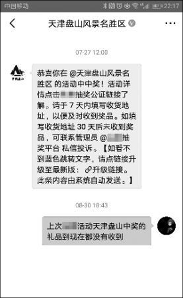 昨天,市民杨先生告诉记者,7月中旬,他在某平台的天津盘山风景名胜区的公众号上参加了抽奖活动。“活动要求关注账号并转发它的一条消息,就可以参加抽奖。奖品是一份价值两千元的景区门票。”杨先生说,他曾经去过盘山风景区,对那里的景色很喜欢,也希望带家人去看看,就抱着试一试的心态,参加了抽奖活动。