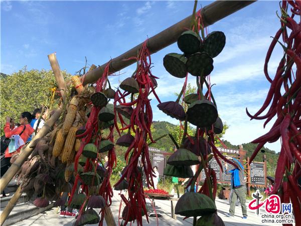 丰收大展台上,摆满了来自当地乡村的绿色无公害农产品,南瓜、红薯、辣椒、板栗、莲蓬、山核桃、花生等众多农特产品,吸引了大量游客参观购买,“品尝着新鲜、地道的乡村瓜果,边观看民俗演出是这次来天堂寨登高踏秋的意外收获”,来自合肥游客赵女士开心的说道。