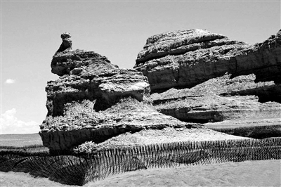 记者从网友拍摄的视频和图片中看到,一块形似孔雀的雅丹地貌景观被密密麻麻的黑色“刺条”围了起来,外围还拉上了绳索,游客只能在绳索之外远远地拍照。