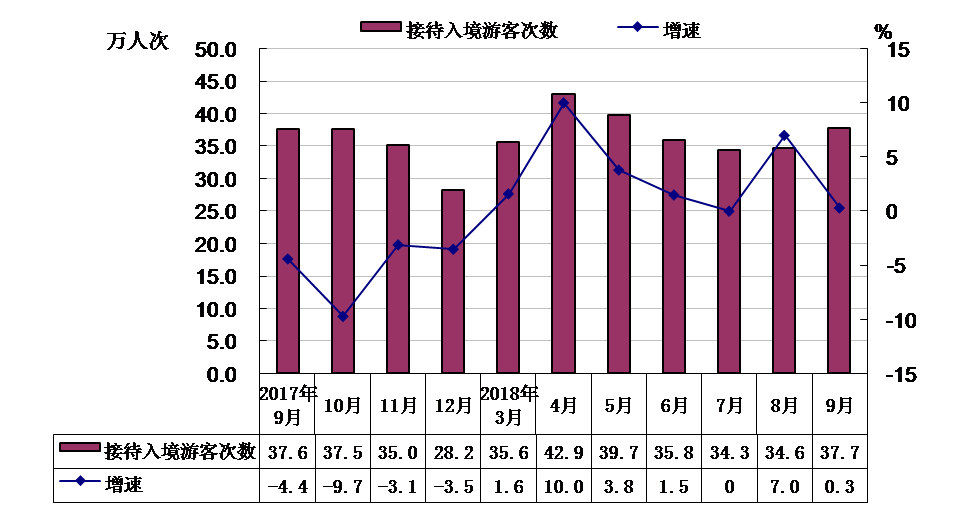 从主要客源国来看,1-9月,累计接待美国游客54.7万人次,同比增长8.8%;接待韩国游客18.7万人次,同比增长10.4%;接待日本游客18.2万人次, 同比增长1.8%;接待德国游客14.7万人次,同比增长1.4%。