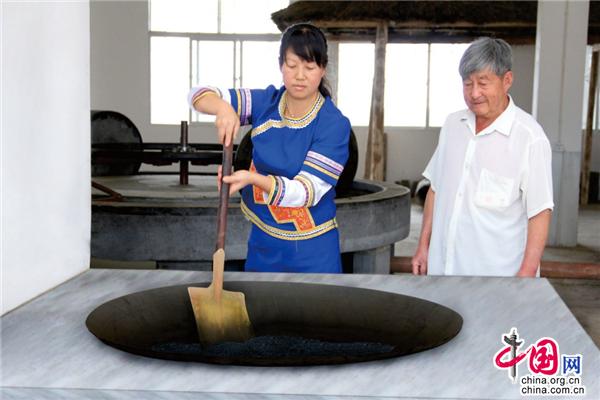 罗平县香逸油脂种植专业合作社5条古法木榨菜籽油生产线,年生产依鲁牌菜籽油1400吨。依鲁古法榨油生产车间的一台水车、一组四个大型石碾子、四个木蒸笼、六套木头榨筒、六个石制油盒子、十四个木制油缸、十四个沉淀罐串联起了古法榨油的重要环节。先将菜籽清洗晾晒,用炒锅把菜籽炒熟去皮,露出黄色的菜籽,然后进行碾磨成粉、上锅隔布蒸煮、出锅扎成圆饼成型,才能上圈装榨,最后木槌撞榨出油。