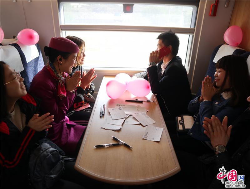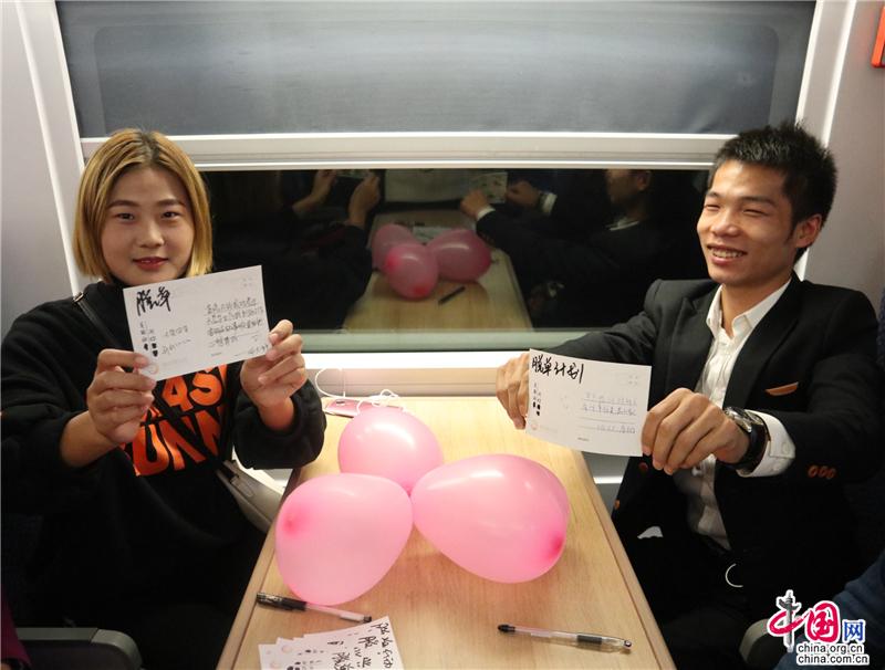 中国网11月12日讯 11月11日“光棍节”前夕,重庆客运段动车二队在重庆北至石柱县D6102次列车上,开展了一场别开生面的“脱单行动”,邀请旅客通过写信、电话连线等方式,大声说出爱。