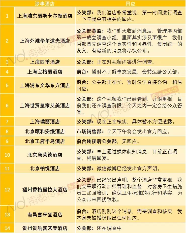此外,记者与其余12家酒店取得联系,截至15日中午1时许,上海浦东丽斯卡尔顿酒店、上海外滩华尔道夫酒店、上海世贸皇家艾美酒店、北京颐和安缦酒店、北京康莱德酒店5家酒店表示下午将会发出正式回应。其余酒店则表示还在调查当中。