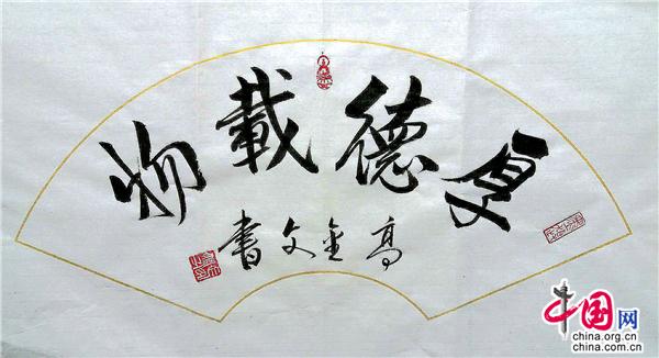 其楷体中规中矩,形制严谨,“厚德载物”几字为其所爱,行笔圆润,笔风醇厚,即得颜真卿之行迹,又有自身之风格。高金文最最钟爱行书,其形体不随意涂洒,笔力遒劲,与其所师怀素之书相比,行笔略显拘谨,谦逊之品透于纸背。