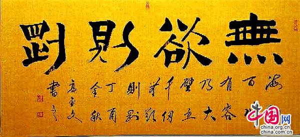 老先生隶书亦为一绝。其体笔力刚劲,一横一竖,都透视出老先生不辍研习的艰苦历程。其所书“无欲则刚”,正如先生品行,自甘清贫,笃守志趣与追求,在书海生涯,皓首穷经,研习不辍。