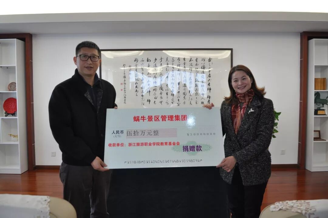 随后浙江旅游职业学院教育基金会理事长韩永良与蜗牛景区管理集团董事长徐挺代表双方签订“蜗牛教育发展基金”捐赠协议;杜兰晓代表学院接受了捐赠并给徐挺颁发了客座教授的聘书、佩戴了校徽。仪式结束后,校企双方就旅游相关专业人才培养和未来更深、更广层面的校企合作等事宜进行了深入交流和探讨。