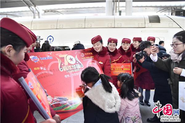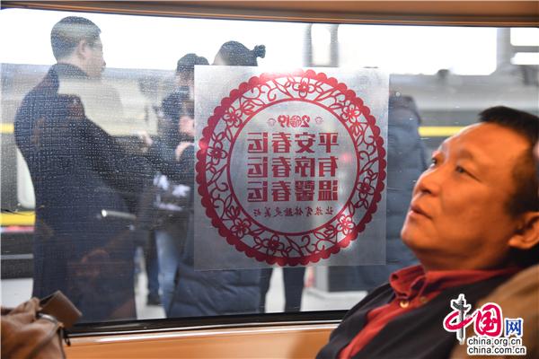 春运首日站台上,浓浓的年味扑面而来。回家过年的气氛浓烈,在大连到上海虹桥G1251次车上、大连到山海关的D31次车上,列车玻璃粘贴着喜庆的“平安春运、有序春运、温馨春运,让旅客体验更美好”等字样的的窗花,同时带有2019年铁路春运购票日历、春运回家的你哪些东西不能带上列车等春运温馨提示服务卡一同发放,让旅客感受到回家路上真正贴心服务;车厢外两名漂亮动姐手拿着一张红彤彤的带有“庆祝中华人民共和国成立70周年,2019春运,我们准备好了”的展板,面带微笑迎接着旅客,旅客高兴的在展板上写下了“祝祖国繁荣昌盛”等的殷殷祝福和“希望亲人和朋友在新的一年身体健康、平安快乐”等新年寄语;旅客小朋友摆着POSS高兴的与身穿熊宝宝和猪宝宝玩偶服的春运志愿者合影留念;身披授带的青年志愿者热情帮旅客拿行李、解答问询、引导上车等。复兴号动车组车模钥匙扣、漂亮动姐和动哥等高铁人物公仔等的小奖品吸引了诸多回家旅客前来参与改革开放40周年、建国70周年以及铁路乘车知识等问答。旅客与列车工作人员、身穿熊宝宝和猪宝宝玩偶服的春运志愿者手拿喜庆的对联、福字、窗花、三个春运卷轴以及建国70周年祝福版在站台上一同留念,温暖和谐的氛围弥漫整个站台、车厢。