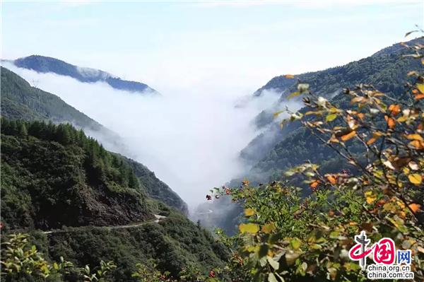 云海穿行于山峦间,随风飘移,时而上升,时而下坠,时而回旋,时而舒展。妙在它似海非海,非海似海,淹没深谷沟壑,连绵的云海在山间浮动,苍苍茫茫,一铺万顷。波澜半阔,一望无边的云海是天然的空气加湿器,潮湿、虚幻、眼看很近想要追逐它却越走越远,最终消失在比地平线更远的地方。