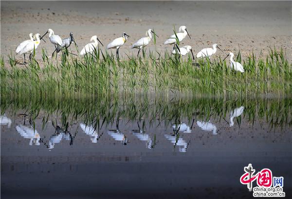 只赏花不过瘾,珍惜的鸟儿也不能错过。得益于丰富的鸟类资源,沙湖曾被美国CNN评为中国观鸟首选之地,是众多鸟类爱好者的观鸟天堂。随着沙湖生态环境的不断改善,湿地的野生鸟类数量逐渐增加,黑鹤、白鹤、中华秋沙鸭、白尾海雕等国家一级保护动物都到这里安家落户,同时这里也是天鹅、白鹳、苍鹭、琵鹭、灰鹤、丹顶鹤、中华野鸭等候鸟的天然家园。