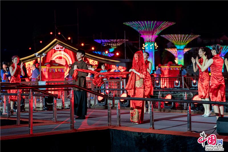 “夜囍”之时,囍庆的锣鼓响起,红妆十里,囍船连绵,良辰吉时到,洞房花烛夜,此时桃花灼灼,他年瓜瓞绵绵。