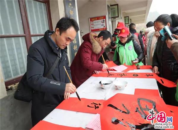 10来位书画家挥毫书写春联。笔者现场看到,一位女村民拿着书法家给写的对联,笑得合不拢嘴。她告诉笔者,大书法家来了,这么好的对联贴在大门上,一年就会风调雨顺,吉祥如意,幸福美满!一位3岁小孩看到书法家给妈妈写的一个“福”, 欢快地接了过来。每个拿到书法家们亲手书写的大红春联和字画的群众都喜笑颜开。“感谢艺术家们不远千里来到明德村给我们送上了欢乐和祝福,感谢党和政府的关怀,脱贫攻坚奔小康,咱们信心更足啦。”当地群众开心地说。