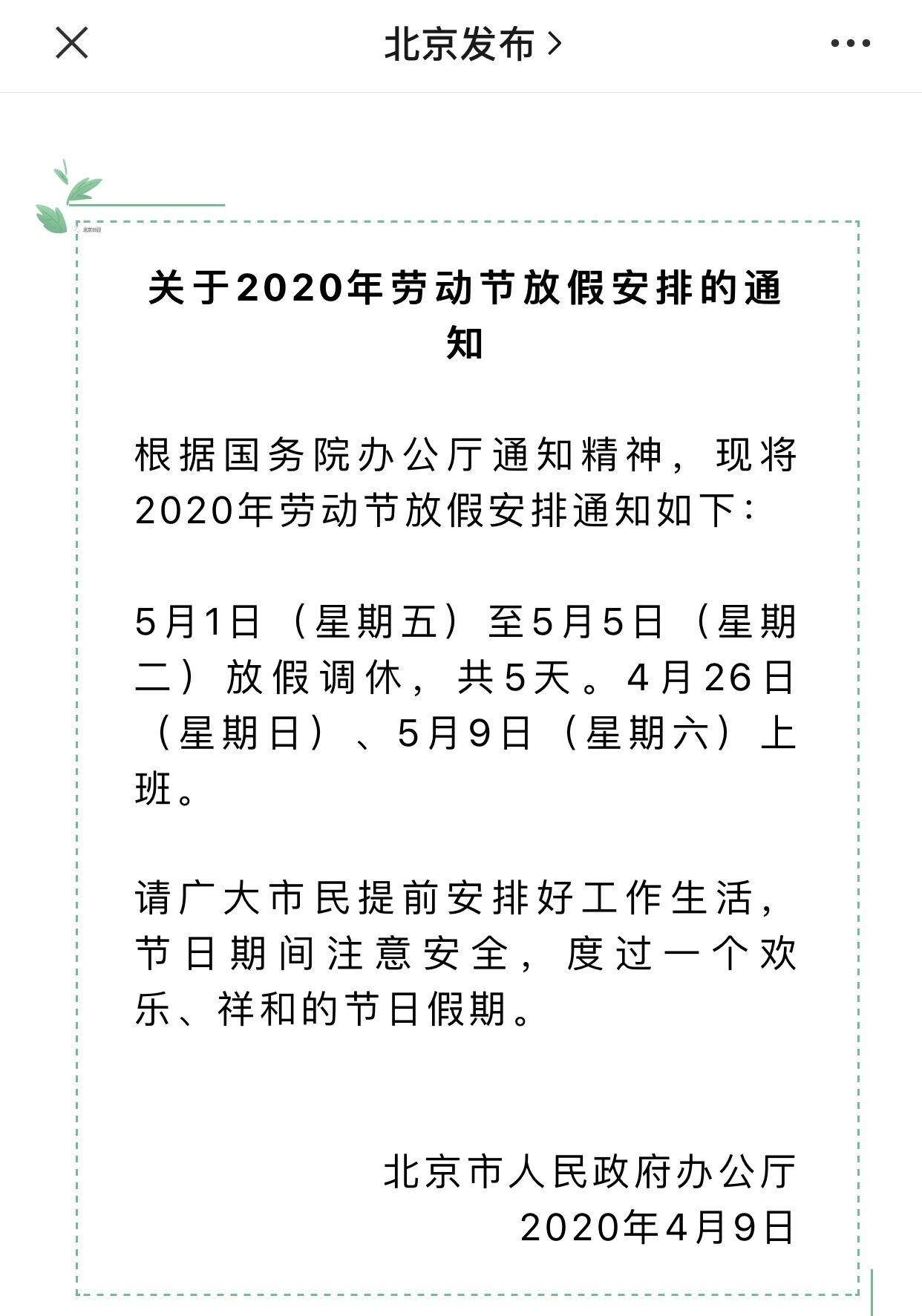 中国网4月9日讯 北京市人民政府办公厅今天下发《关于2020年劳动节放假安排的通知》(以下简称《通知》)。《通知》显示,2020年“五一”劳动节将连休五天。