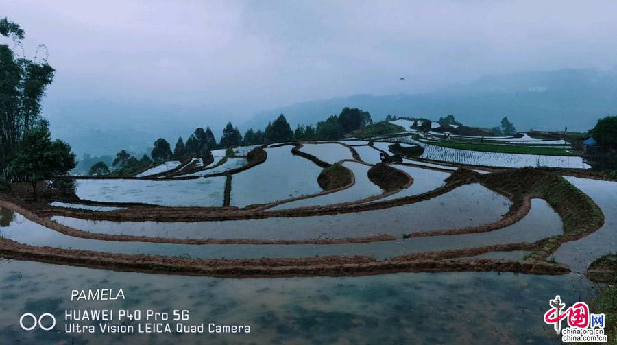 如果说中山古镇是“月明乌镇桥边夜,梦里犹呼起看山”的市井人家,那么太和梯田则是“暧暧远人村,依依墟里烟”的乡野田园。第二天的清晨依然雾雨朦胧,摄影师们到达太和梯田时,宛如明镜的梯田鳞次层叠,天色山光倒映其中,妙不可言。在这里,白鹭栖于田埂,鸭群跳进水塘,人要脱去城市的外壳,才能触及到野风。