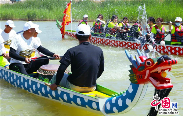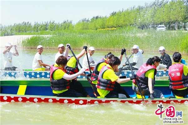 端午期间,宁夏沙湖不仅准备了新鲜的粽叶和软香的糯米,供游客大展身手,还利用广阔优美的湖面,特意推出龙舟表演活动,让前来游玩的旅客不仅能欣赏到优美的风景还能观赏到激情澎湃的龙舟表演。游客乘坐仿古船透过船窗便可看到轻巧的龙舟在船舷旁宛若游龙穿梭在碧绿的湖面上,顷刻间,加油呐喊声、鼓声、号子声此起彼伏,场面蔚为壮观,不禁令人感受到浓浓的端午节日氛围。