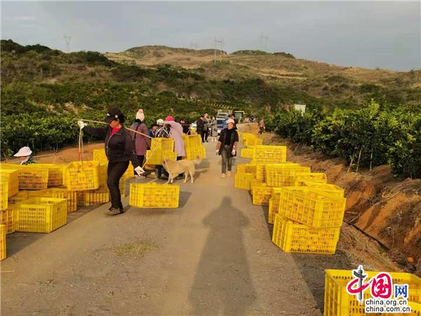 跌宕起伏的群山,放眼望去是满眼的绿,当熟的脐橙和尚带青尾的沃柑,或沉甸在枝头泛出黄澄澄的诱人金色,或掩藏于青翠绿叶间探头探脑好似在垂问何时瓜熟蒂落。橘林里几百工人或用双手上下翻飞剪下已糖足色满的脐橙,或三三两两肩挑满筐的熟果穿行在果园中……